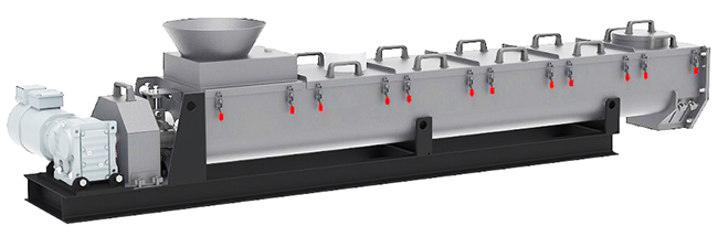 一次脱水污泥(含水率80%左右)由螺旋输送器直接送入调理机系统,或进入污泥储罐再由螺杆泵送至调理系统。调理过程包括污泥转化和污泥稳定,转化阶段污泥和调理剂均匀混合,经稳定处理后完成污泥的调理。